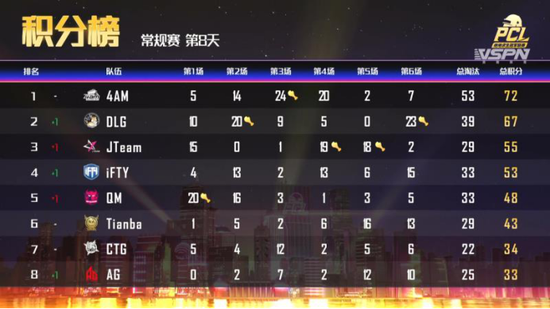 2020PCL秋季赛常规赛已经走过了一周的赛程,截止目前,积分榜榜首被多赛一轮的Tianba战队占据,他们在36场比赛中拿到191个淘汰,以总分287分傲视群雄;同样多赛一轮的KX战队紧随其后收获第二;夺冠大热门iFTY战队依旧延续了火爆的竞技状态,在少赛6场的情况下拿到了249分,位列总积分的第三位;在第八个比赛日爆发的4AM战队位列第四,夺魁雄心可见一斑。